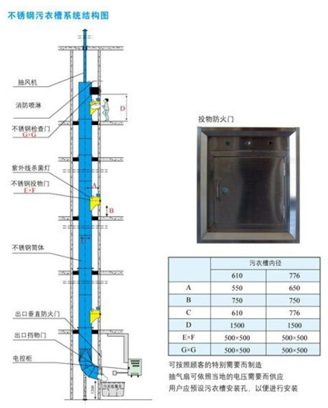 污衣槽配電控門鎖后,整條污衣槽于任何時間內(nèi)只能讓其中一個污衣投物門開啟,及同時間內(nèi)不能開啟兩扇及以上污衣投物門。投物門外框頂裝設(shè)電鎖控制操作箱,控制箱上有開門按鈕,顯示槽筒在使用中的紅色指示燈,顯示槽筒可以使用的綠色指示燈。污衣槽功能介紹 :